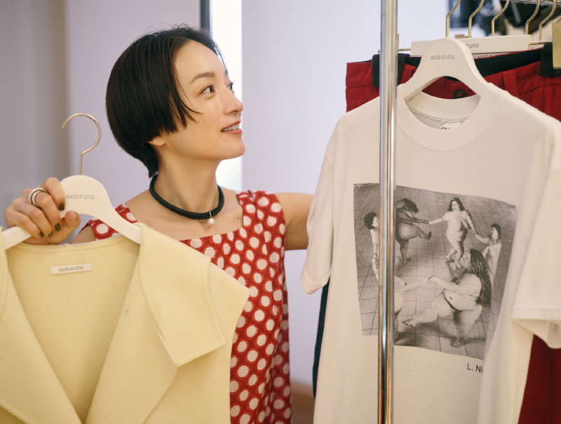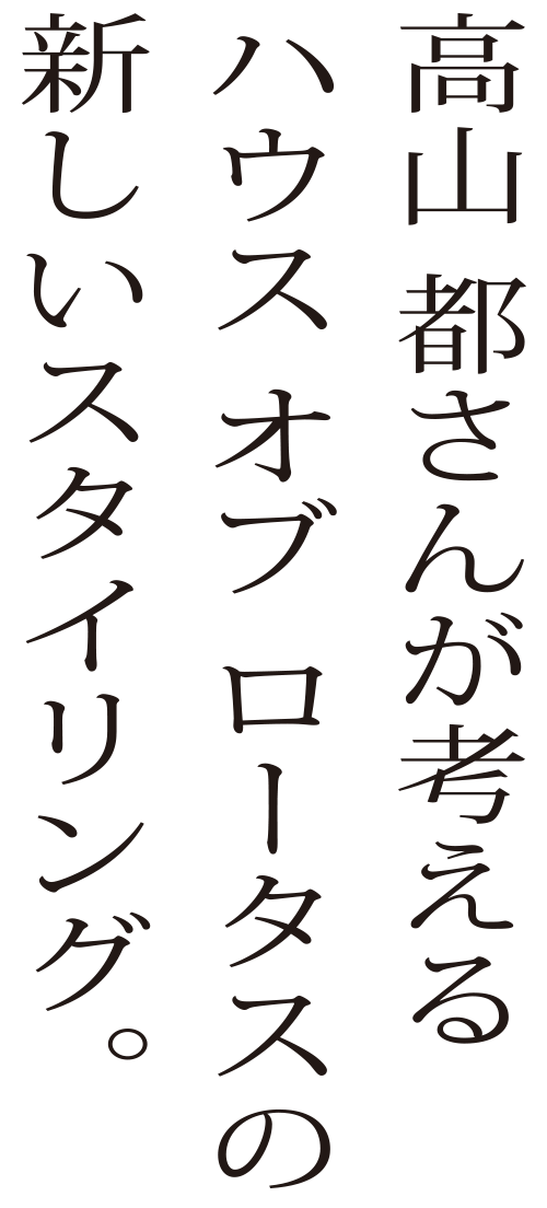 普段からHOUSE OF LOTUSの服を愛用し、「新しい上質なものに、自分がこれまで大切にしてきた“古き良きもの”を組み合わせて、自分らしいミックススタイルを楽しむのが好き」という高山 都さんに、セルフスタイリングで着こなしてもらいました。