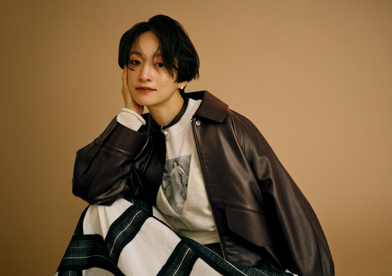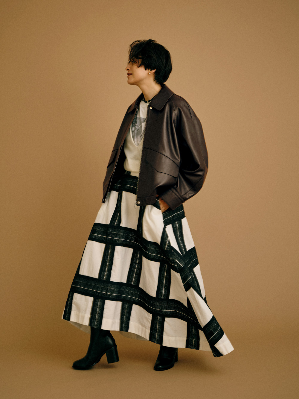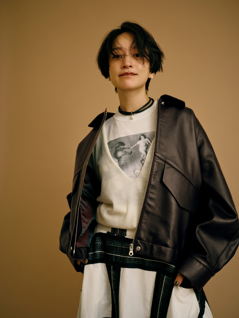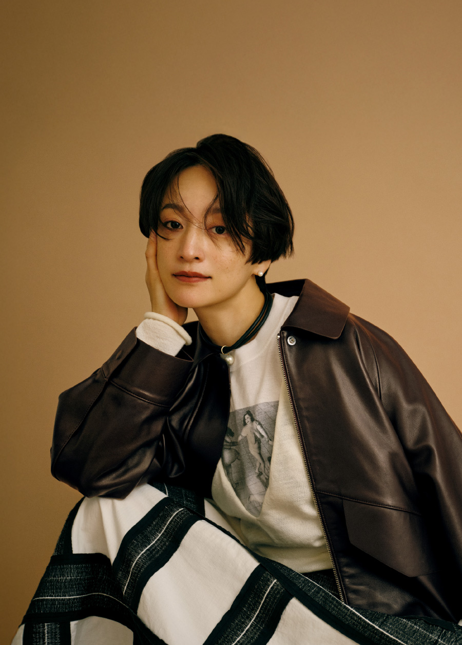 程よいボリューム感と丸みがあるシルエットで、メンズライクにも着こなせるレザーブルゾン。インパクトのあるスカートはそれだけでも映えるけれど、Vネックのニットからお気に入りの古着Tシャツを少しだけ見せて遊び心も。チョコレートブラウンのアウターにモノトーンのアイテムを合わせ、好きなものをいろいろMIXしたけれどすっきり見えるように工夫しました。(Tシャツ/アクセサリー/シューズ : 高山都さん私物・参考商品)