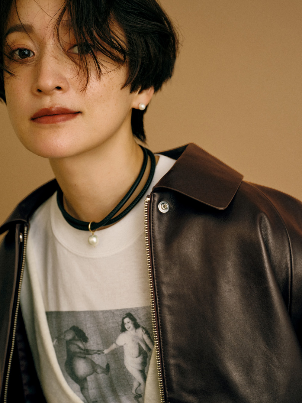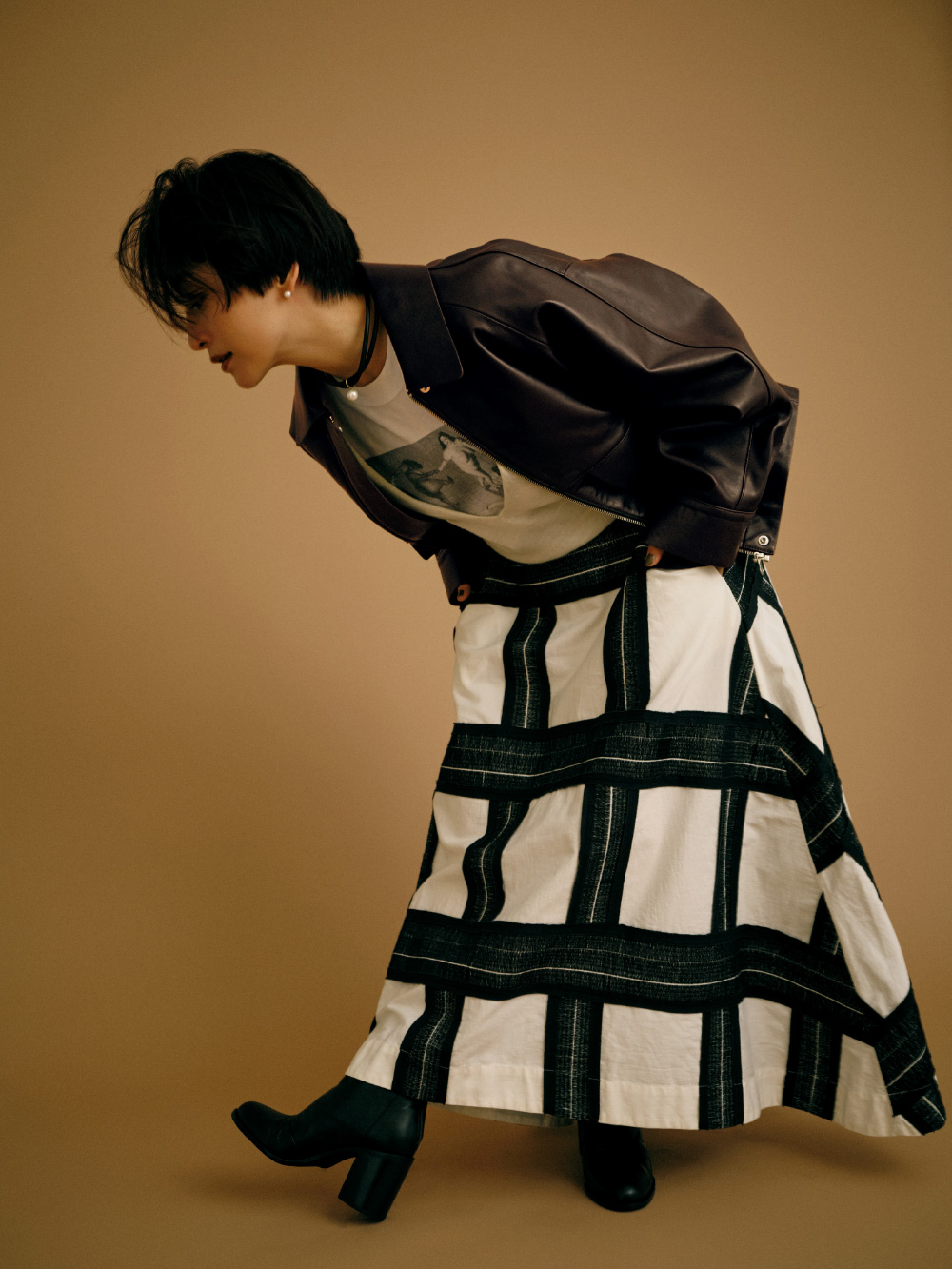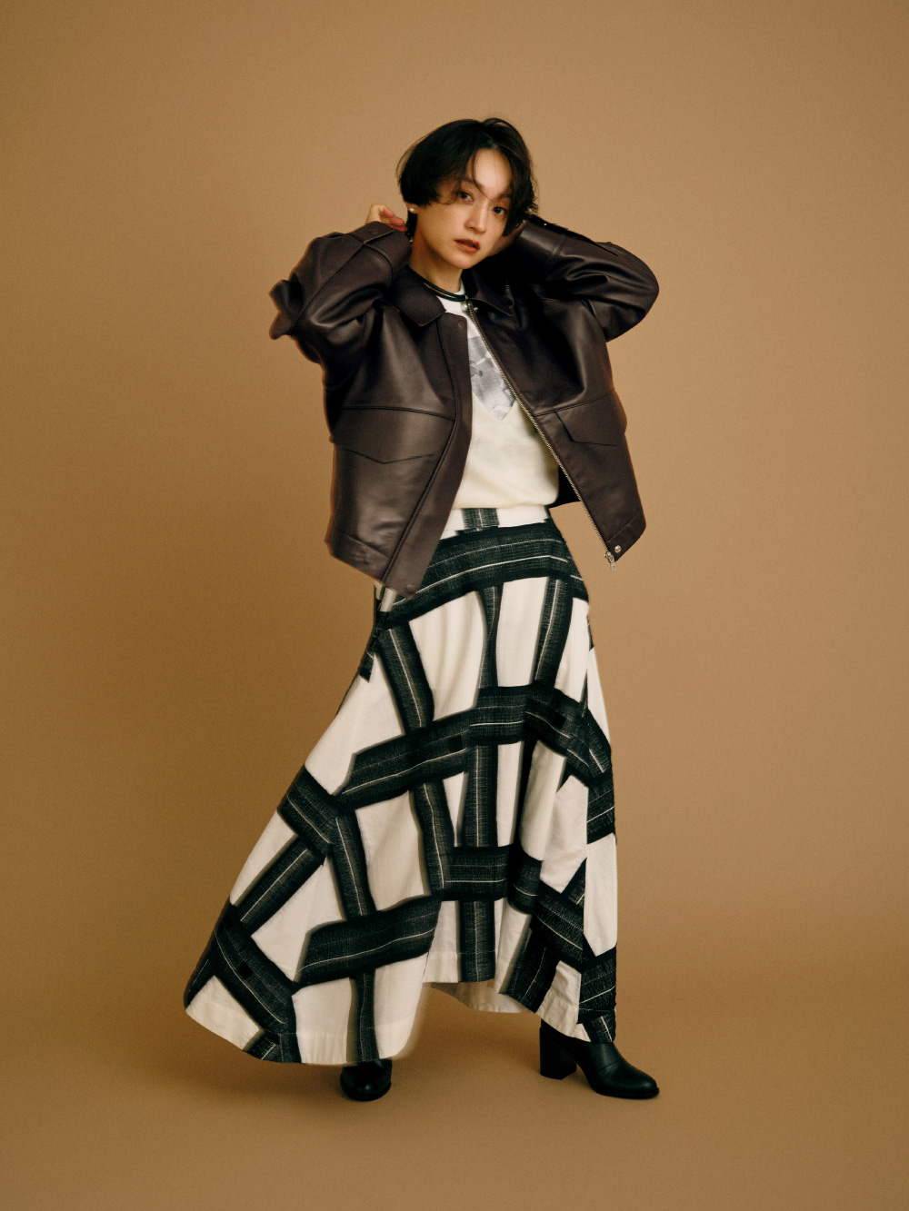 程よいボリューム感と丸みがあるシルエットで、メンズライクにも着こなせるレザーブルゾン。インパクトのあるスカートはそれだけでも映えるけれど、Vネックのニットからお気に入りの古着Tシャツを少しだけ見せて遊び心も。チョコレートブラウンのアウターにモノトーンのアイテムを合わせ、好きなものをいろいろMIXしたけれどすっきり見えるように工夫しました。(Tシャツ/アクセサリー/シューズ : 高山都さん私物・参考商品)