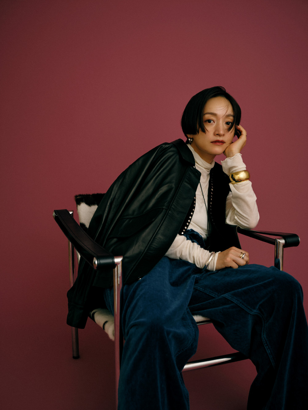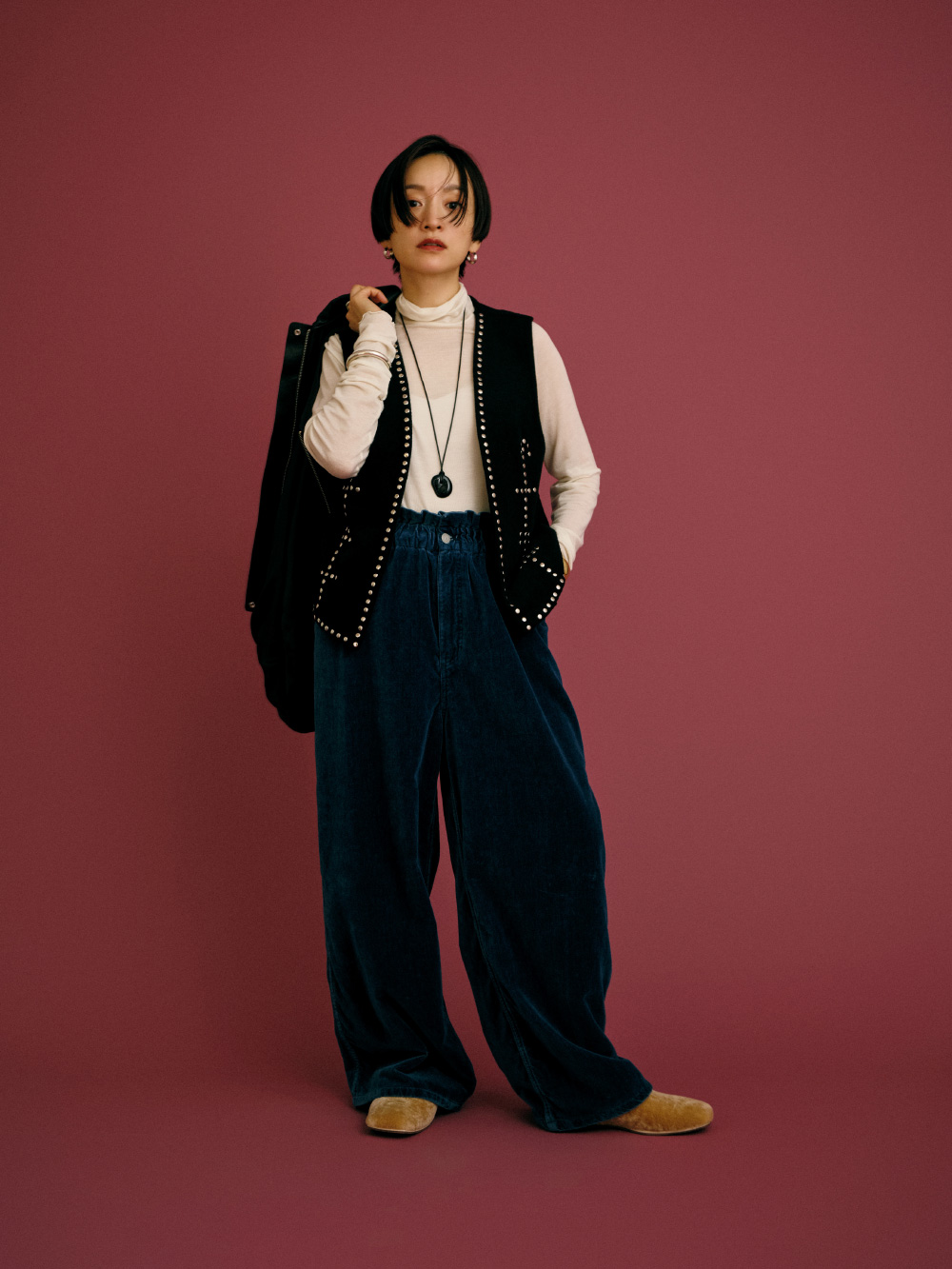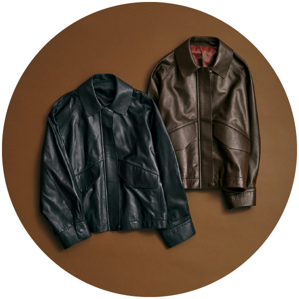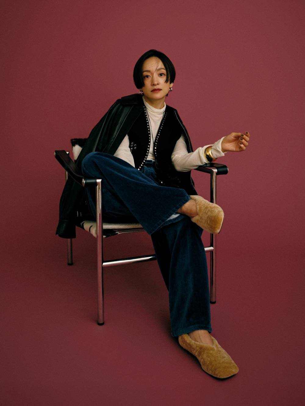 “一生もののジャケット”になりそうな、上質なラムレザー素材のブルゾン。きれいめに着るのもいいけれど、スタッズ付きのベストや大きめのバングルを合わせて、自分なりに着崩してみました。インにスタッズを見せることで、奥行きとエッジもプラス。ベロアのやわらかいパンツでリラックスした抜け感も出て、“大人のグランジ”スタイルの完成。ブルゾンはアームホールが広くて袖を通しやすいから、インナーに厚手のニットを着ても大丈夫。(アクセサリー : 高山都さん私物・参考商品)