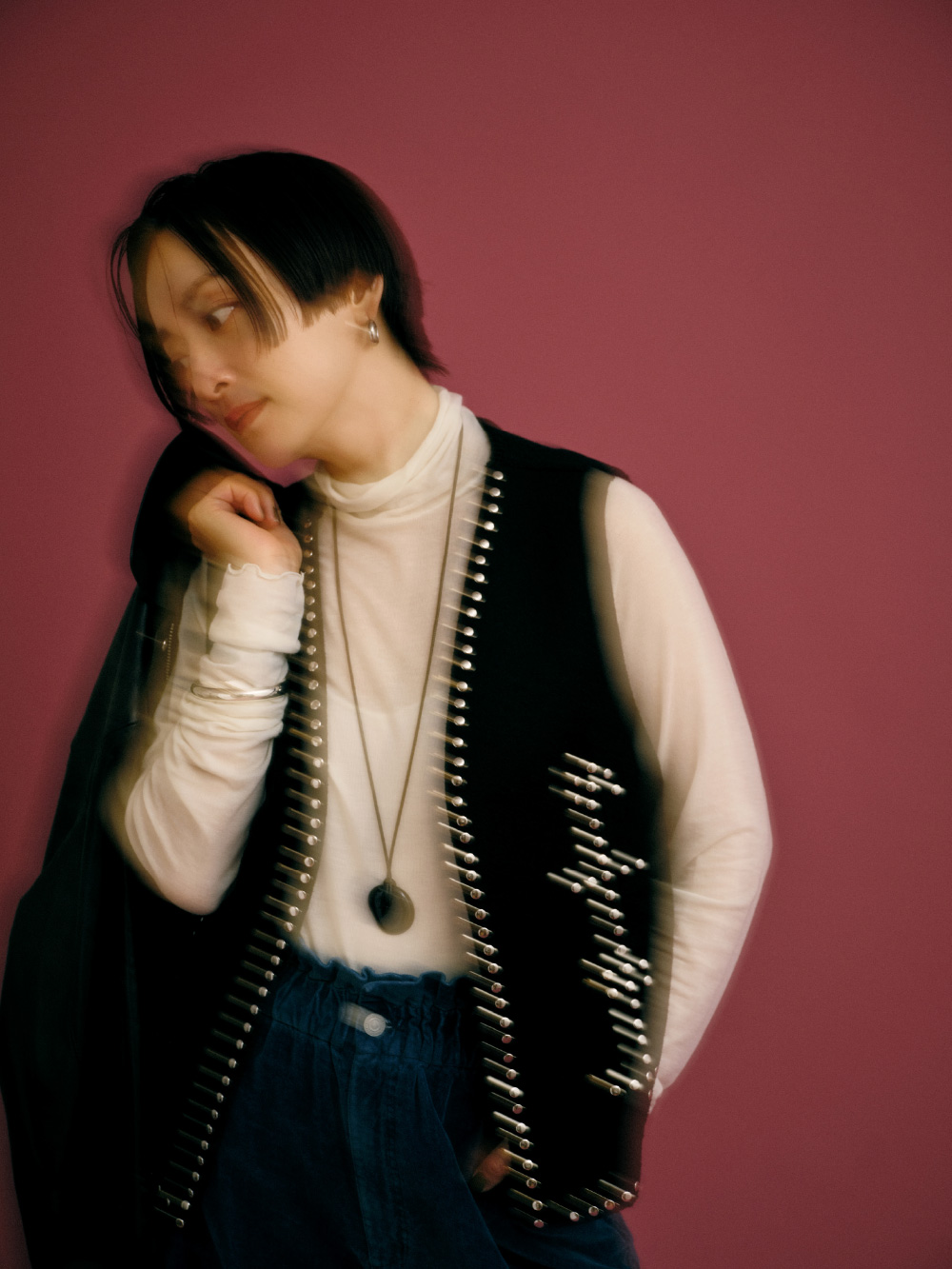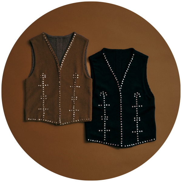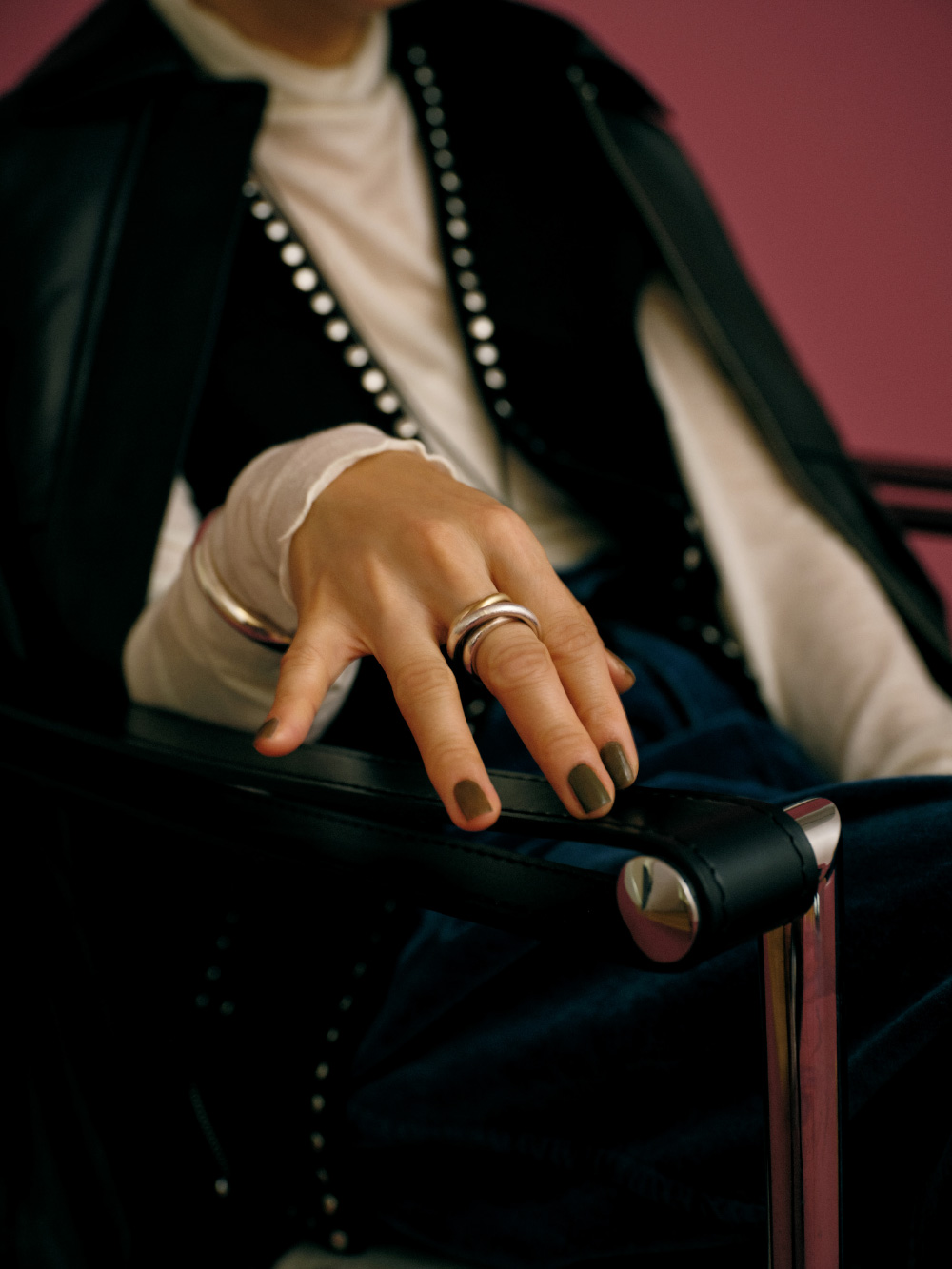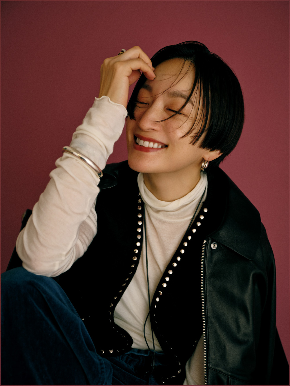 “一生もののジャケット”になりそうな、上質なラムレザー素材のブルゾン。きれいめに着るのもいいけれど、スタッズ付きのベストや大きめのバングルを合わせて、自分なりに着崩してみました。インにスタッズを見せることで、奥行きとエッジもプラス。ベロアのやわらかいパンツでリラックスした抜け感も出て、“大人のグランジ”スタイルの完成。ブルゾンはアームホールが広くて袖を通しやすいから、インナーに厚手のニットを着ても大丈夫。(アクセサリー : 高山都さん私物・参考商品)