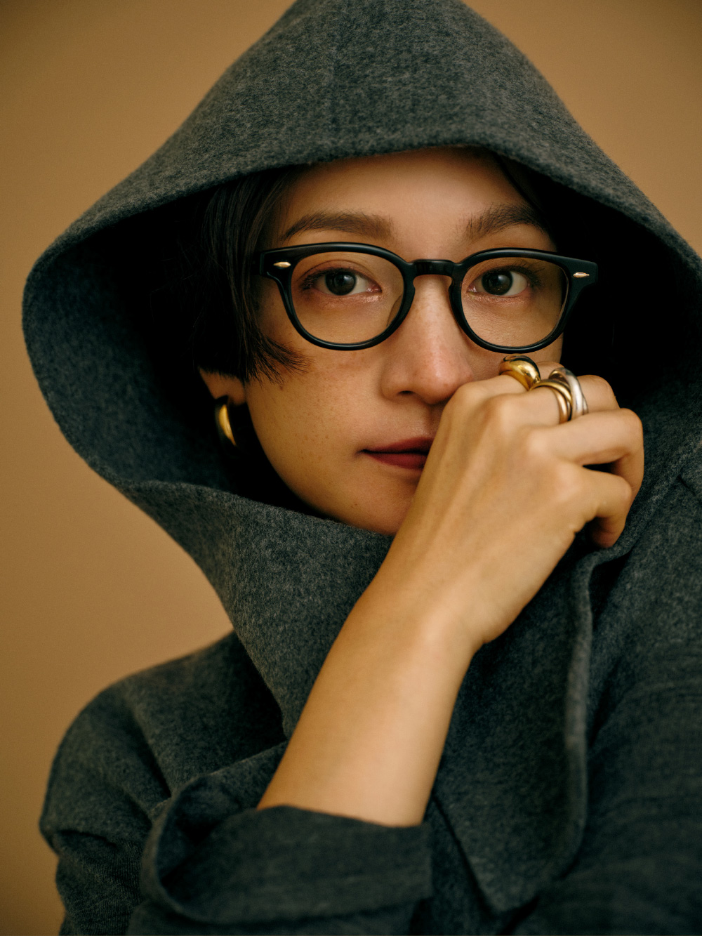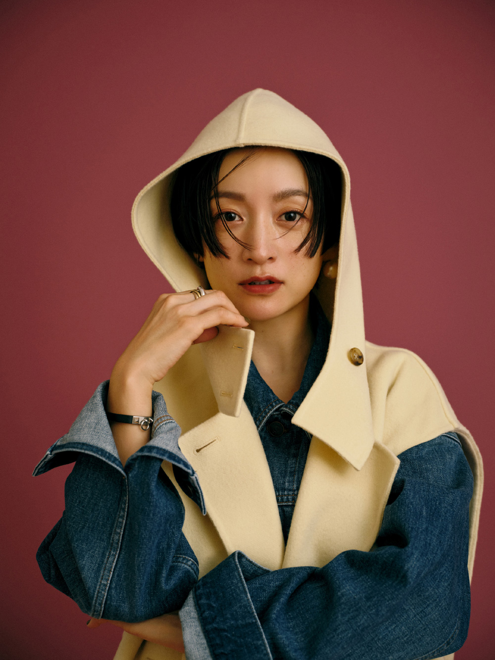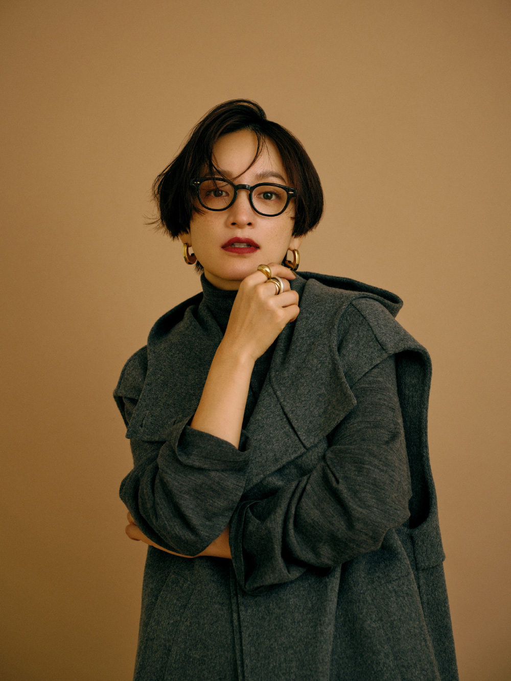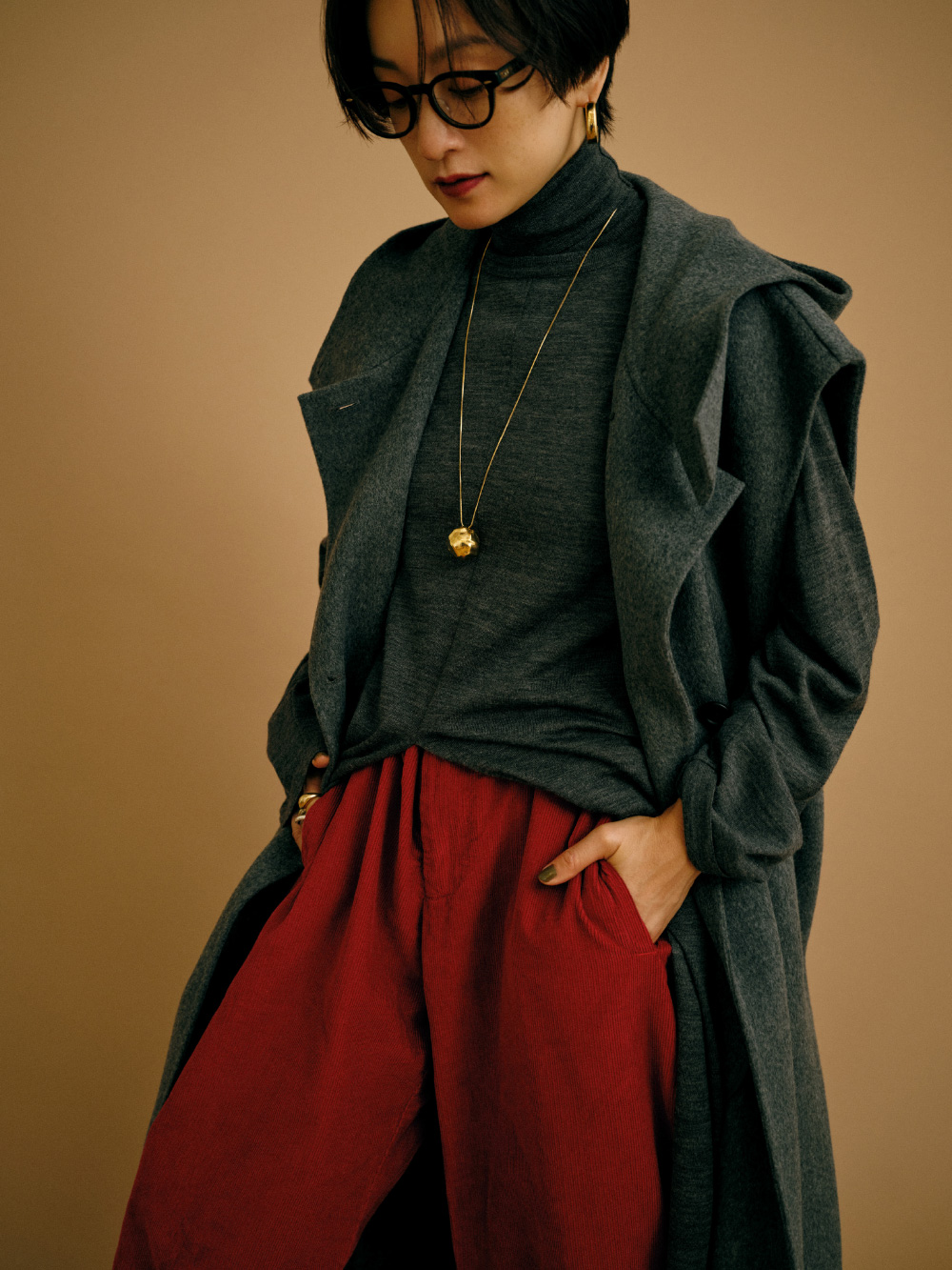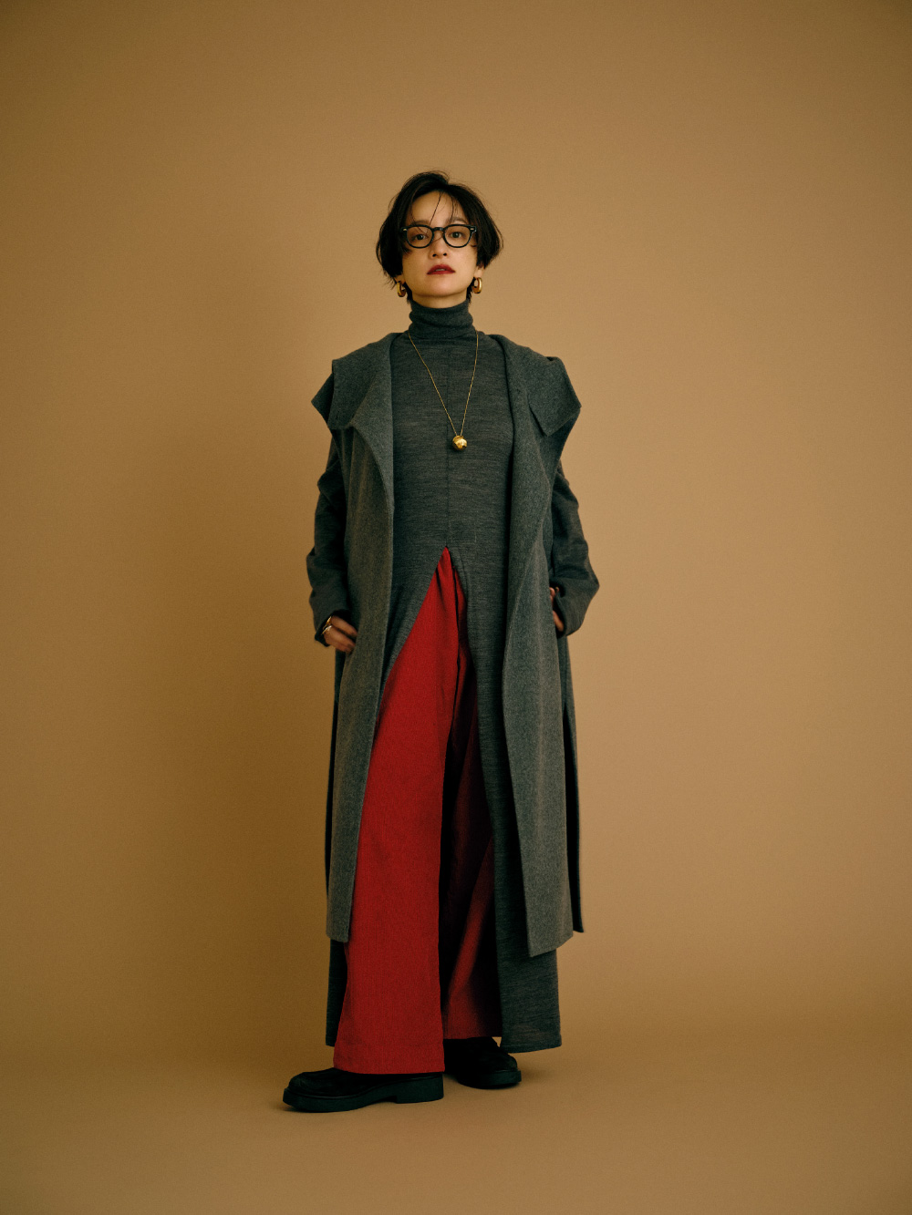 フード付きのロングジレにニットワンピースを重ね、カラーパンツをアクセントに。ジレとワンピースには深いスリットが入っているのでボトム選びでガラリと印象が変わるんです。赤いリップを合わせるような感覚でパンツを選んだのでメイクもリンクしました。ローファーや眼鏡をプラスしてトラッド感もある、私らしいコーディネートに。(パンツ/アクセサリー/シューズ:高山都さん私物・参考商品)