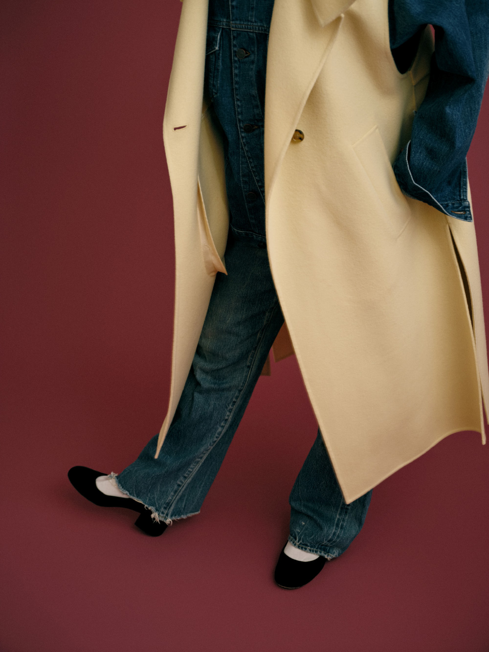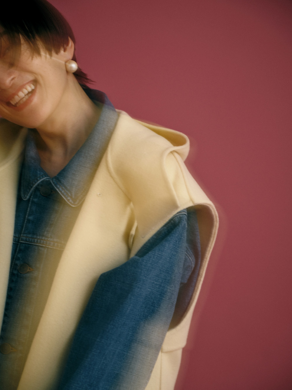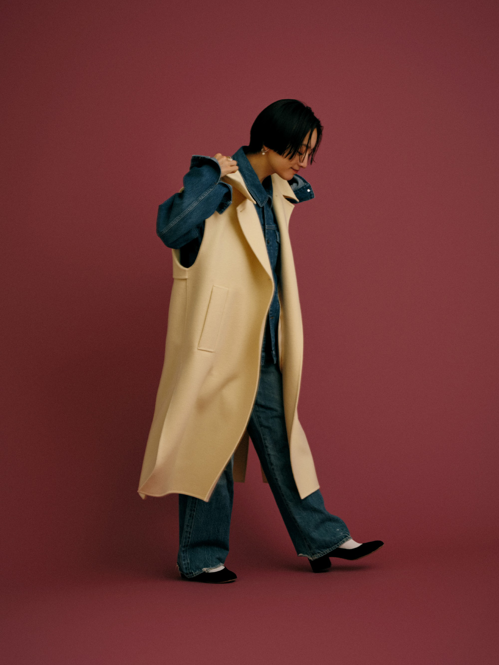 デニムジャケットとパンツをセットアップ風に組み合わせ、ウール素材のロングジレをレイヤード。Iラインでまとめることで、スタイルアップして見えるのがポイントです。ブルーとイエロークリームの色合わせも好きで、シューズやソックスを差し色にして配色がより際立つようにしました。小物は控えめにエレガントなものを選び、デニムでもカジュアルになり過ぎず、上品さも感じられるスタイルです。(デニムジャケット&パンツ/アクセサリー/シューズ : 高山都さん私物・参考商品)
