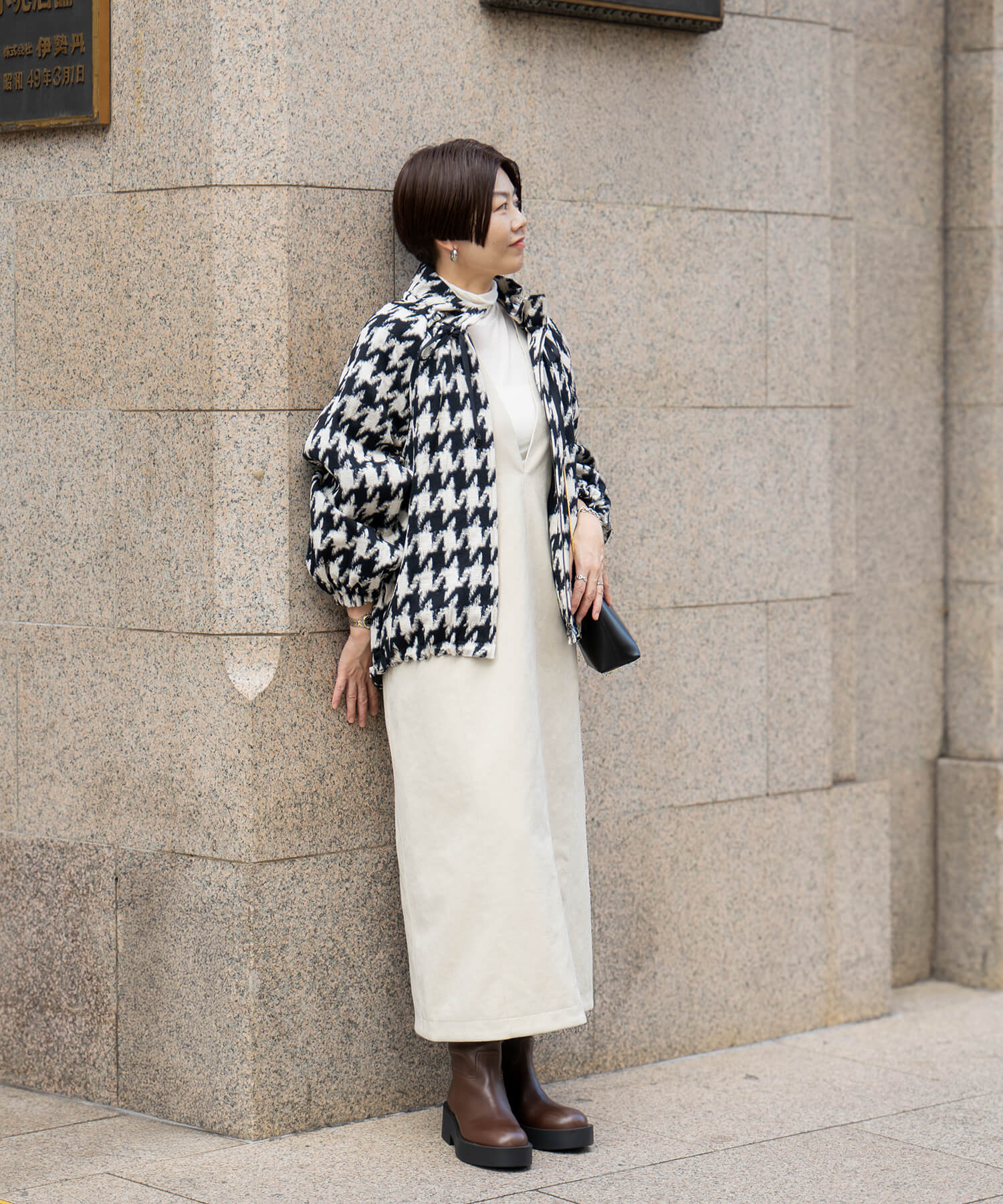 オンもオフも両立できるアウターとしてワードローブに迎えたいブルゾン。いわゆるクラシックなツイードとは一線を画すビッグガンクラブチェックがモダンな印象に。襟元はドローコードでフリルのようにアレンジして甘さをひとさじプラス。今回はオールホワイトでまとめてヘルシーに着こなしてみました。休日のデニム&スニーカースタイルにサッと羽織っても決まるのがうれしい。