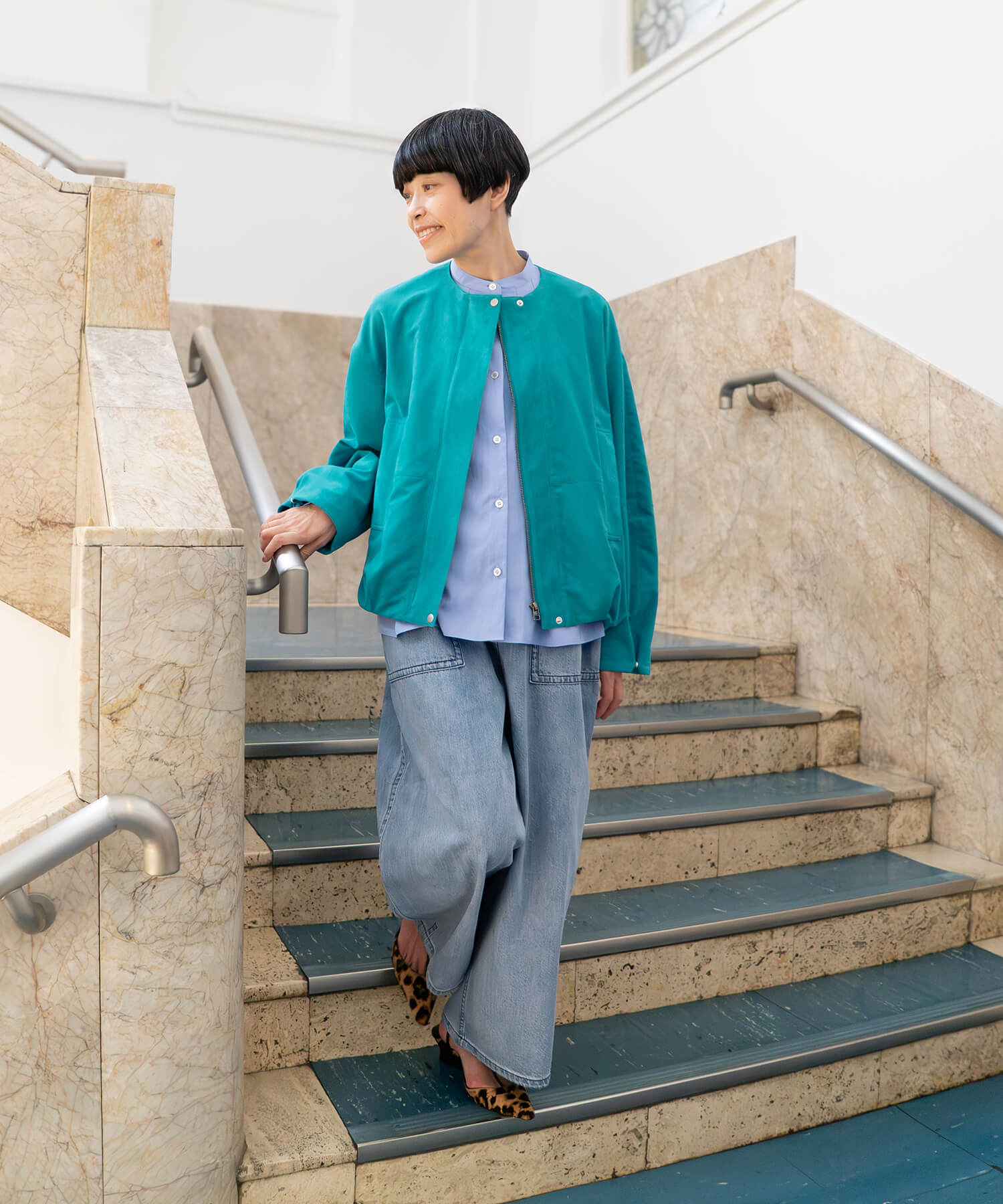 今シーズントレンドのスエードも自分らしいターコイズをチョイス。驚くほどしなやかで軽く、カーディガン感覚で気軽に羽織れるブルゾンは後ろがバルーンシルエットになっているバックシャンなデザイン。重たくなりがちな秋の装いもカラーで遊び心を出したくて、ブルーのグラデーションでまとめてみました。