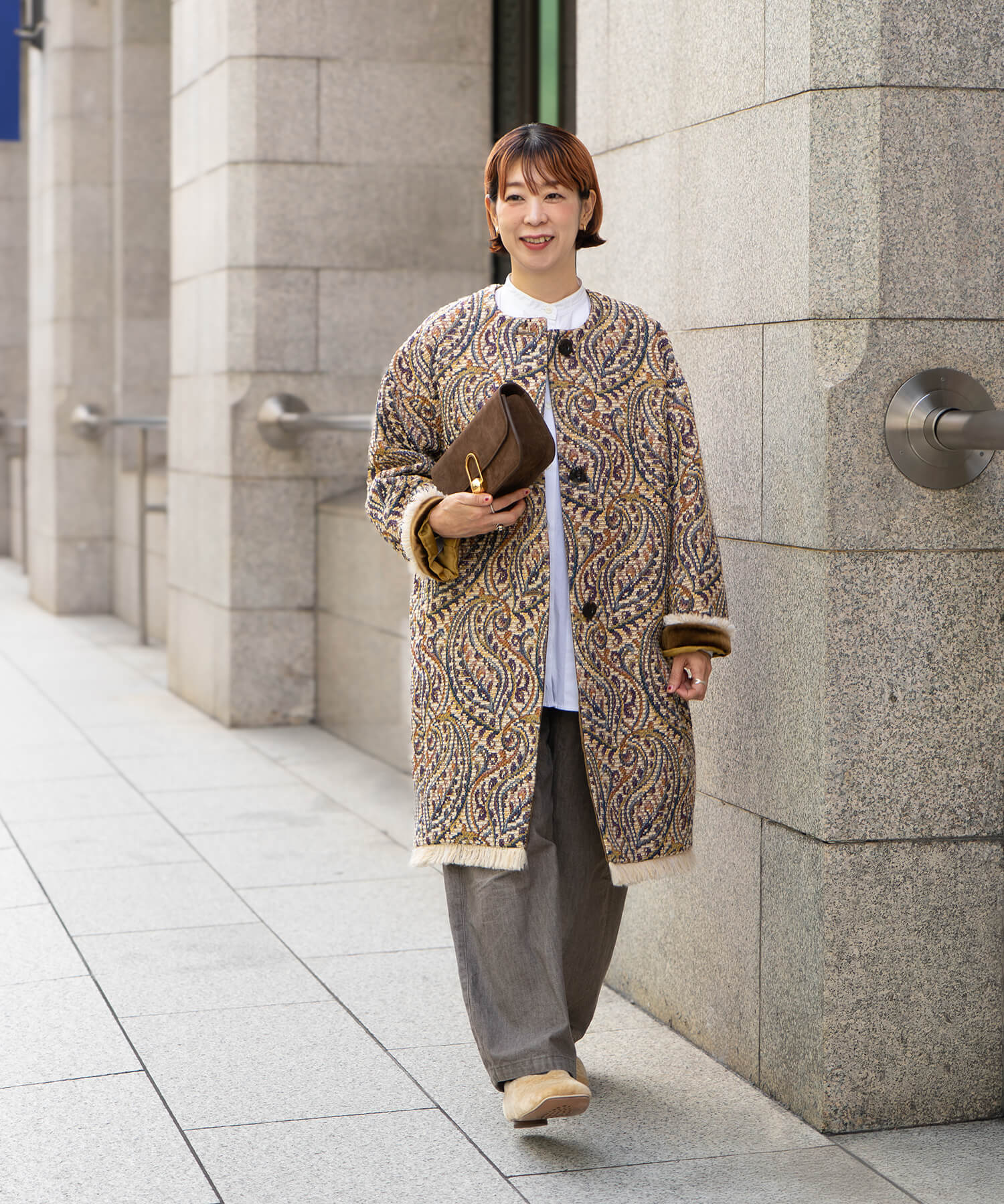 展示会で一目惚れしたジャカードコートをクリーン&モダンに着こなしました。アンティークのような重厚感のある生地と多彩な配色と相反するマニッシュなシャツ&パンツのコーディネートが今の気分にぴったり。見返しと袖裏にあしらわれたベロアはちらりと見せてアクセントに。流行関係なく、マイ・ヴィンテージとして大切に着ていきたい逸品です。