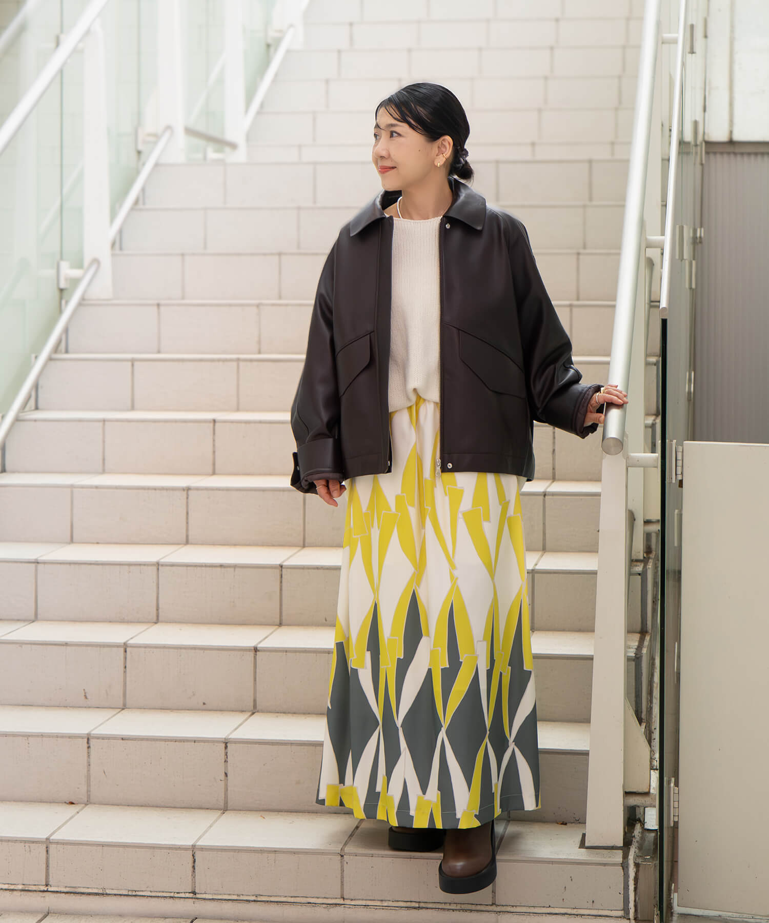 ボリューム感のあるレザーブルゾンをわざと大きめにバサッと羽織りたくて選びました。フロントはすっきりと、バックにかけて丸みのあるフォルムが出て、小柄なわたしもちょうどいいバランス。チョコレートのようなダークブラウンがシックな雰囲気もあり気に入っています。ハードになりすぎないようにフェミニンなスカートと合わせたところがポイント。